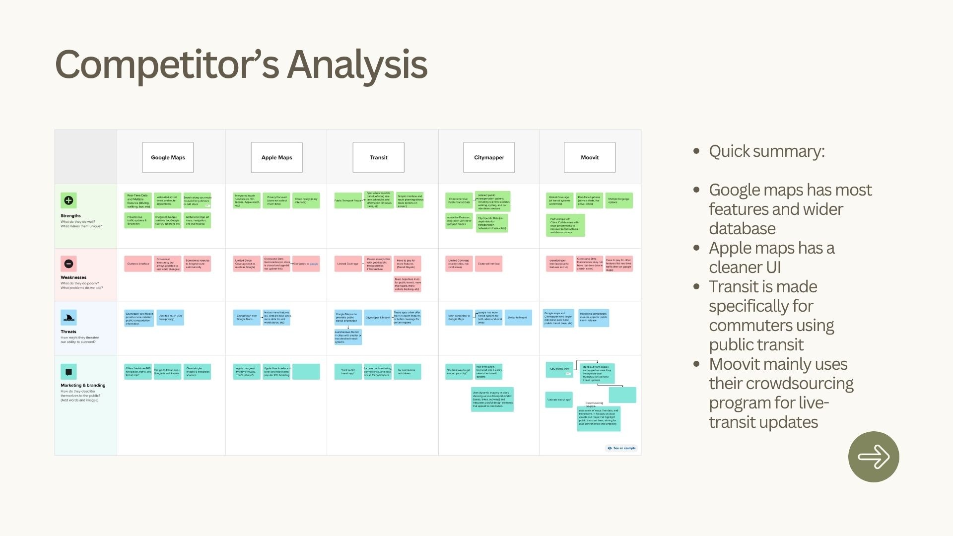 Through competitor analysis, I observed that Moovit mitigates this issue by incorporating crowdsourced data, allowing users to report delays and conditions in real time. While this approach can improve accuracy, it relies on active user participation and falls outside the scope of Google Maps’ existing data ecosystem.